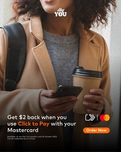 Reward yourself with every sip ☕ Get $2 back when you use Click to Pay with your Mastercard Available at any Hey You location Valid until 26 Oct 2025 Redeem up to 4 times Seems to be slightly …